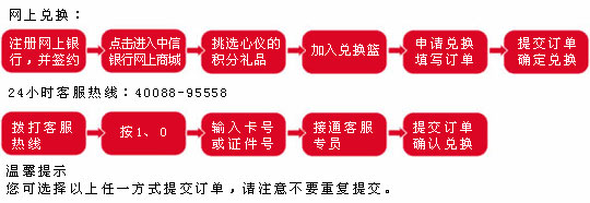 2.兑换方式除航空类联名卡、电信V卡、12580联名卡,其他可累积积分的中信信用卡均可以进行积分礼品兑换,如有特殊情况请见产品具体信息。