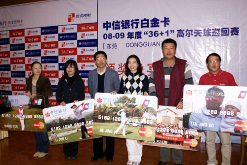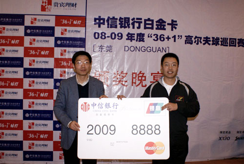 颁奖晚宴上,中信银行设置的各项大奖也隆重颁出:最远距离奖和最近旗洞奖分别由俞宏伟、周永平获得;最佳射手奖获得者分别是周斌和刘金标;BB奖由李俊莉获得;徐超、郭晓冬、蔡东升、周斌均获得最具潜力奖;净杆的冠、亚、季军分别是谭镜波、徐佳丽、付明;总杆冠、亚、季军则被阮伟文、王克荣、俞宏伟获得。本站比赛首次设置的特别奖――新年精选吉祥卡号(末位为2009-8888)被来自东莞本土的黎敏先生抽中,成为本站比赛最幸运的一位。