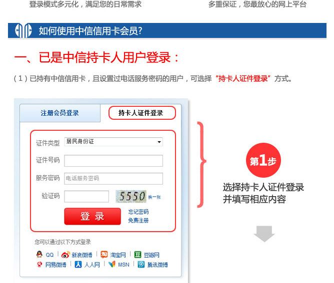 新版信用卡会员系统将增加“用户名、邮箱、手机号码”方式登录,为您提供多元化的服务,敬请期待。