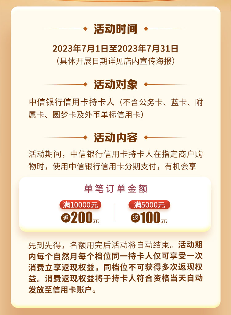 活动期间,中信银行信用卡持卡人在指定商户购物时,使用中信银行信用卡分期支付,可享单笔订单满5000元立返100元,活动名额1000名,或单笔订单满10000元立返200元,活动名额2500名,先到先得,名额用完后活动将自动结束。活动期内每个自然月每个档位同一持卡人仅可享受一次消费立享返现权益,同档位不可获得多次返现权益。消费返现权益将于持卡人符合资格当天自动发放至信用卡账户。