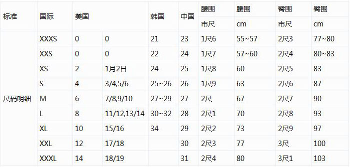 上述腰围指实际腰身尺寸,并不是裤子的尺码。