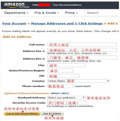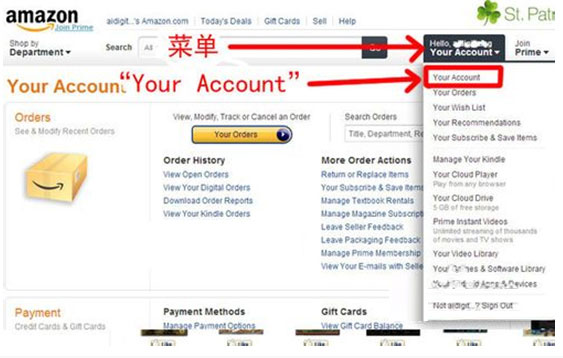 STEP1 在这里添加信用卡和收货地址资料(收货地址就是转运商提供的美国地址)在右侧下拉菜单中找“Your Account”