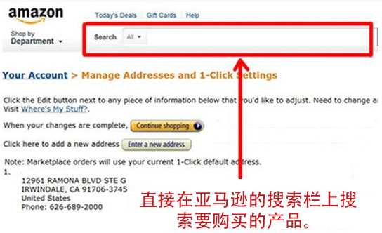 STEP1 购买东西,可以直接在亚马逊的搜索栏输入产品名称、型号或品牌就能够轻易找到你要购买的东西。