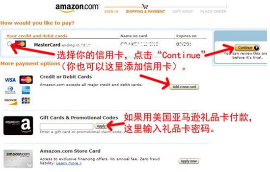 选择付款方式如果之前没有添加过自己的信用卡信息,将在此步骤进行添加(详细见步骤二-4)如果购物前已经将自己的信用卡信息输入,请选择你的卡然后点“Continue”。