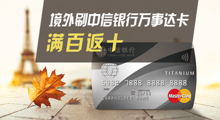 | 满百返十 | 中信银行万事达钛金卡、白金卡、世界卡 | 单笔消费满100美元返现10美元,每卡每月最高返12笔,即120美元,其中线上交易每月最高返现20美元,线下交易每月最高返现100美元。总限量。 | 登记参与 |