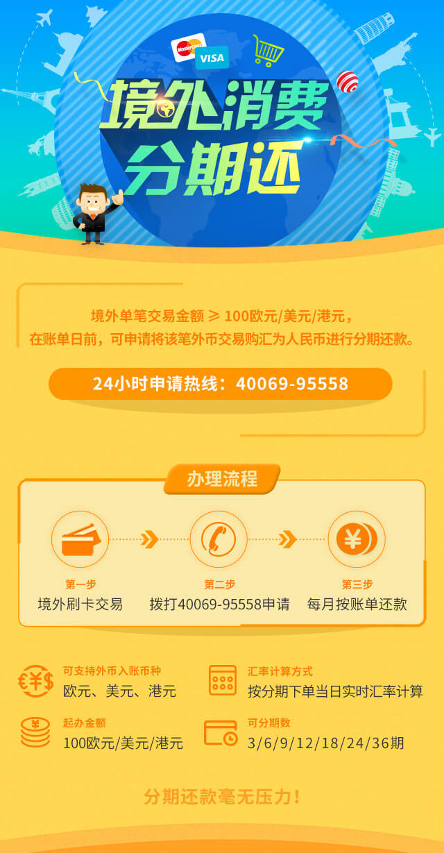 可申请办理境外交易单笔分期的外币入账金额≥100欧元/美元/港元。