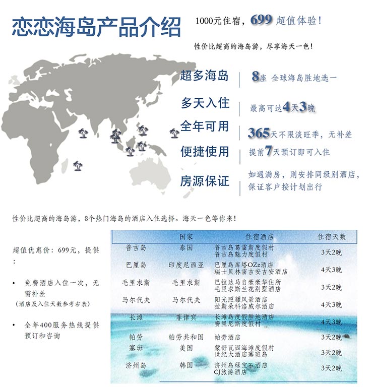 | 恋恋海岛 | A7 | 699元/年 | A;全球8个热门海岛(普吉岛/巴厘岛/马尔代夫/济州岛等)最高4天3晚免费住宿 B:0起点短信提醒 |