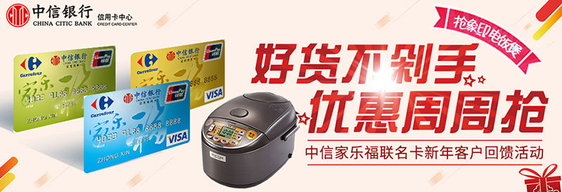 参与条件:活动期间每周一至周五在家乐福店内累计交易满999元,即可在每周日上午10点登陆中信信用卡积分商城(wap端及动卡空间)以599元抢购象印电饭煲(市场价4,198元)一台,整个活动周期内每人限抢兑1台,每周限量200份,抢完即止,礼品总数800份。