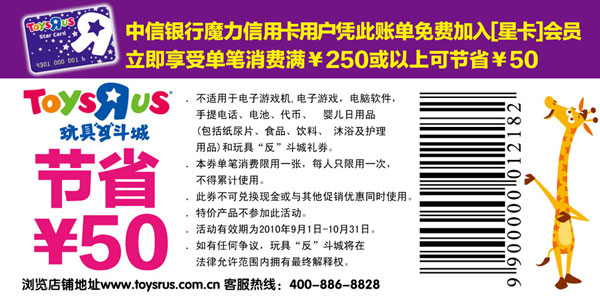 中信银行魔力信用卡客户凭优惠券免费加入「星卡」会员,立即享受单笔消费满¥250或以上可节省¥50!