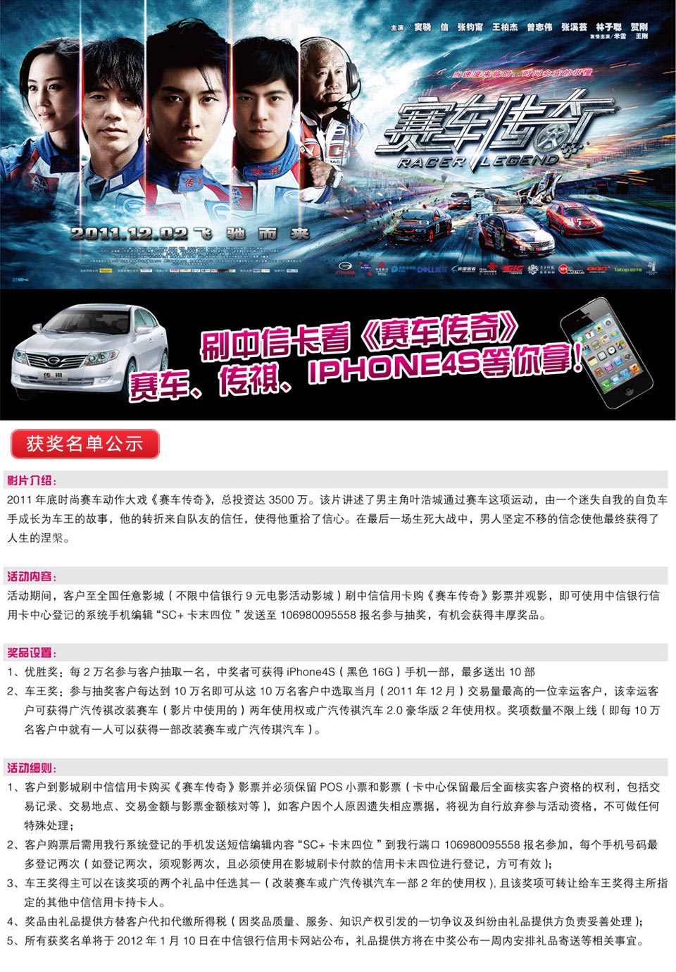 刷中信卡看《赛车传奇》,赛车、IPHONE4S等你拿! 优惠活动 中信银行信用卡中心